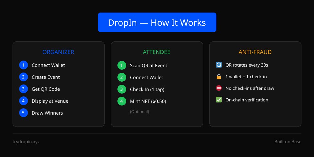 DropIn is a Web3-native event platform that brings check-ins, giveaways, and attendance tracking on-chain. Built on Base (Coinbase's L2), it provides transparency, verifiability, and seamless wallet integration.